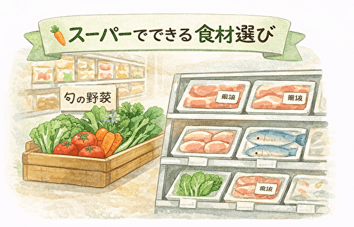 子育て家庭でも続けやすい食材の選び方についてまとめています。