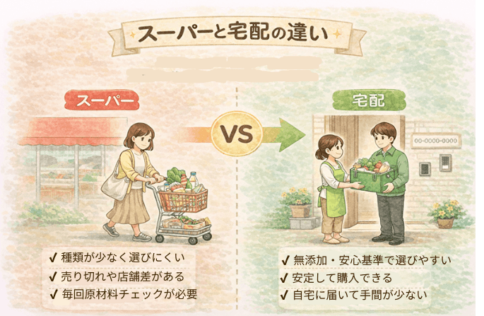 スーパーと食材宅配の違いから分かりやすく解説します。