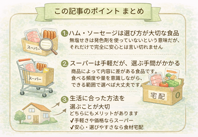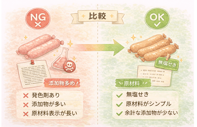 安心なハム・ソーセージを選ぶ際、ここまでの内容をまとめると次のような違いがあります。